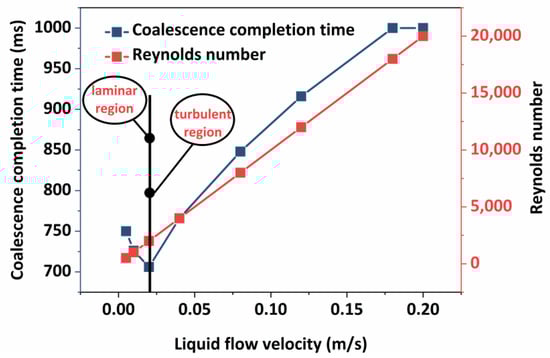 Figure 11 demonstrates that in the laminar flow zone, the coalescence period of oil droplets reduces as the liquid flow rate increases. However, when the liquid flow rate increases in the turbulent zone, the time it takes for oil droplets to coalesce steadily increases. Because of the relative stability of the fluid flow in the laminar flow process, the oil droplets are subjected to the liquid flow’s carrying effect, increasing the likelihood of collision. At the same time, the liquid flow’s carrying kinetic energy supplies energy to breach the interfacial membrane of the oil droplets, reducing the time required for coalescence completion. From within the turbulent zone, it can be seen that the coalescence time of the oil droplets gradually increases with the increase in the liquid flow rate in the turbulent zone, which is completely opposite to the coalescence law of the oil droplets in the laminar flow stage. Under turbulent conditions, the fluctuation of the liquid flow is more violent, and the coalescence process between the oil droplets is more complicated. The simple study of two oil droplets affected by the disturbance of the liquid flow has some limitations. In order to investigate the coalescence and stability characteristics of multiple oil droplets further under different flow patterns, experimental studies on the coalescence process of oil droplets under liquid flow perturbation are carried out. The experimental results are shown in Figure 12.