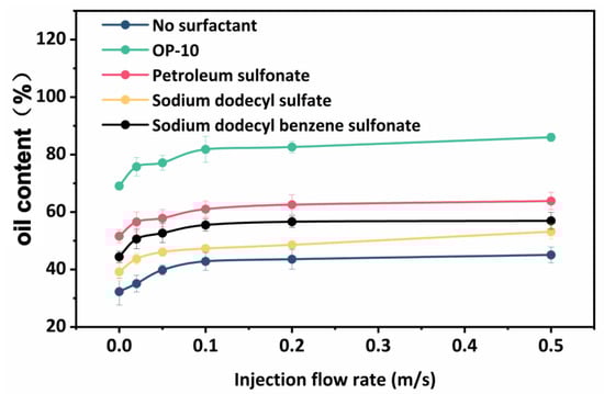 After adding surfactants, the oil content in the emulsion system increased dramatically, with different surfactants causing varying increases. Overall, the pumping flow rate influences the rise in oil content in the emulsion system. As the pumping flow rate grows gradually, so does the oil content of the emulsion system, but the increase is limited. The curves representing the changes in oil content for various surfactants do not intersect or abruptly rise. This is because the extracted fluid in the reservoir’s porous media creates a stable emulsion structure, which prevents the emulsification level in the exterior and surface pipelines from changing noticeably.