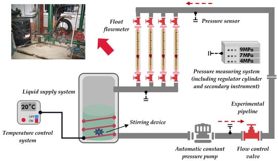 The composition of the experimental device includes a liquid supply system (including a stirring device), a temperature control system, and a parameter measurement system. The liquid supply system was used to pump the prepared solution into the pipeline and adjust the flow rate through the valve. The agitator was used to stir the solution to stratify the water–crude mixture. The temperature control system was used to keep track of the temperature of the sample, including the temperature controller, heating device, cooling device, and measuring point heat tracing system. The parameter measurement system was mainly used to measure the flow rate of the fluid passing through the vertical experimental pipeline under stable flow conditions and the pressure difference at the corresponding point, which was read from the pressure sensor.