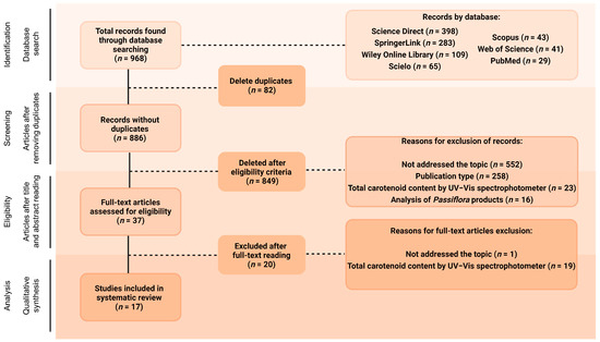 The database search, using different combinations of the chosen keywords, was blindly conducted by three of the co-authors and found a total of 968 documents (Figure 1). All the documents were arranged in the software Rayyan® [32] to perform the posterior selection stages. After removing duplicates (n = 82), titles and abstracts of the remaining 886 articles were blindly read by three of the co-authors, and 849 of them (95.82%) were excluded for not meeting the inclusion criteria. Of these, 552 articles (65.02%) were excluded for not addressing carotenoid composition analyses, and 258 (30.39%) for consisting of publication types not considered in this review, such as review articles, conference abstracts, case studies, editorials, letters or brief communications, and book chapters. Another 23 studies (2.71%) were excluded at this stage for offering only analysis of the total carotenoid content of the crude extracts without previous separation, while 16 papers (1.88%) were not included since they analysed several products obtained from parts of Passiflora plants, not the parts themselves. Therefore, 37 articles were selected for full-text reading, and 17 of them were included in this review (representing 4.18% and 1.92% of the initial number of articles, respectively, not considering the duplicate ones, Figure 1). Of the 20 articles excluded at the full-text reading stage, 19 analysed only total carotenoids, and one study focused on the functional groups found in carotenoids rather than the individual identification.