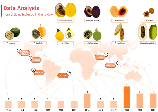 The second largest country in the included publications, Ecuador is the main exporter of concentrated sour passion fruit juice (from P. edulis, 50° brix), P. edulis f. flavicarpa (yellow passion fruit) being the most cultivated species in this country, as it is in Brazil and Peru [41], while in South Africa and Australia, the purple passion fruit (P. edulis f. edulis) stands out in production [42,43]. In Colombia, the neighbouring country of Ecuador, besides P. edulis, five other species are grown commercially, namely P. ligularis, P. tripartita, P. edulis f. edulis, P. maliformis, and P. quadrangularis [42,44], but no study has been included from this country.