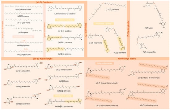 Carotenoids constitute a family of more than 700 lipophilic compounds imparting yellow, orange, and red hues to a wide range of plant tissues, in which they play primary roles as part of the photosynthetic apparatus, especially in leaves, as well as secondary functions as antifungal agents and flavour components [19,20]. Structurally, they are characterised by a hydrocarbon backbone containing a series of conjugated double bonds (cdb, commonly in the more stable (all-E)-configuration) and can be classified as carotenes and xanthophylls, the latter presenting oxygenated groups in their molecule in contrast to the former. Hydroxylated xanthophylls can be naturally found esterified with fatty acids to constitute the carotenoid esters, which are often neglected given the increased complexity in analysis [21].