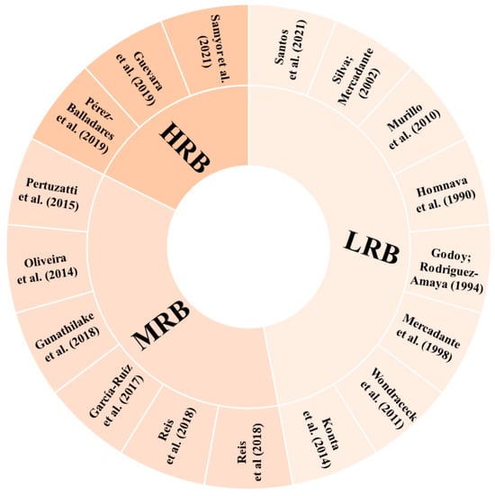 According to the parameters determined for the risk of bias in the identification of carotenoids, eight studies (47.06%) showed low risk of bias (LRQ), six studies (35.29%) showed moderate risk of bias (MRB), and three studies (17.65%) showed high risk of bias (HRB) (Figure 5). Some studies did not present the methods applied for the carotenoid analysis in a way that they could be reproduced. In cases where it was not possible to clearly identify whether or how some step was performed, the parameter was considered as “unclear”. In addition, for articles that referenced to another study without a brief or explicit description, it was considered that the authors performed the experiment under the same conditions as described in the cited reference.