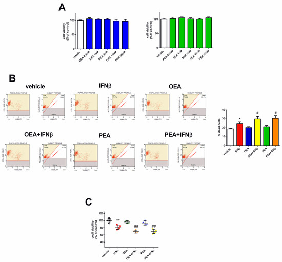 Figure 1. OEA, PEA, and IFNβ treatment effect on SH-SY5Y cell viability. Cells were treated for 24 h with vehicle, OEA, or PEA. Cell viability was then assessed by the MTT assay (A). Cells were pre-treated with OEA and PEA (3 µM–6 h) and then stimulated with IFNβ (5 ng/mL–24 h). The viability was measured by the Muse® Viability kit. Values are reported as the percentage of dead cells and are represented as the mean ± SEM of four experiments. * p < 0.05 versus vehicle and # p < 0.05 versus IFNβ (B). SH-SY5Y cells were pre-treated with OEA and PEA (3 µM–6 h) and then stimulated with IFNβ (5 ng/mL–24 h) and cell viability was assessed by a luminescence assay. The values are expressed as percentage of control (vehicle) and the results are represented as the mean ± SEM of four independent experiments. ** p < 0.01 versus vehicle and ## p < 0.01 versus IFNβ (C).