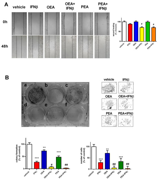 Figure 2. OEA, PEA, and IFNβ effect on cell proliferation and clonogenicity. Cells were treated for 48 h with the vehicle, OEA or PEA (3 µM), and IFNβ (5 ng/mL). Representative images show the scratch wound healing assay performed on treated SH-SY5Y cells. The percentage of wound closure in the scratch assay was measured. Values are reported as the mean ± SEM of four experiments. # p < 0.05 versus IFNβ. Magnitude 10× (A). Cells were seeded at a cell density of 200 cells/well in a six-well plate for the clonogenic assay and were exposed to (a) vehicle; (b) IFNβ 5 ng/mL; (c) OEA 3 µM; (d) OEA + IFNβ; (e) PEA 3 µM; or (f) PEA + IFNβ. Cells were stained with crystal violet to visualize colonies formed by 50 or more cells. Representative pictures of cell density were taken under a microscope after treatment. The number of formed colonies and the number of cells present in each well were quantified and are represented above as percentage of control (vehicle). ** p < 0.01 and *** p < 0.001 versus vehicle-treated cells; # p < 0.05 and ## p < 0.01 versus IFNβ. Values are reported as the mean ± SEM of four experiments (B).
