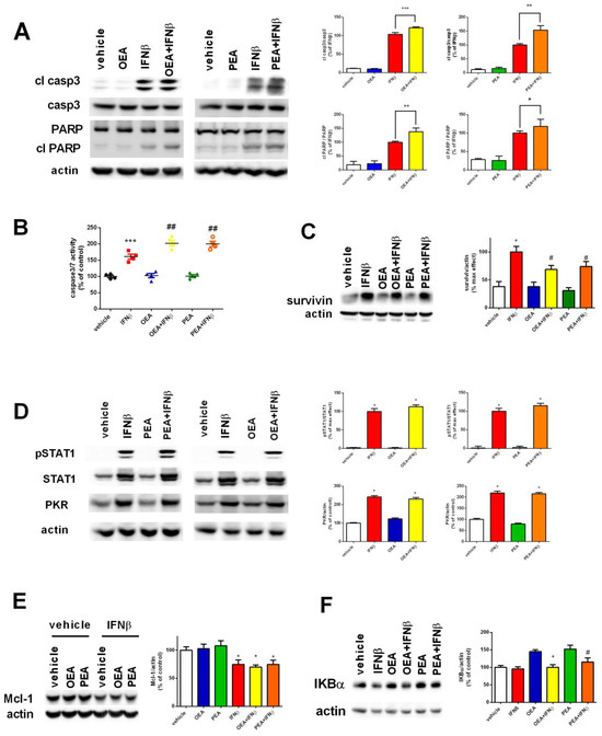 Figure 3. Assessment of intrinsic apoptosis after exposure to OEA, PEA, and IFNβ. Cells were pre-treated with OEA and PEA (3 µM - 6 h) and then stimulated with IFNβ (5 ng/mL - 24 h). Cell lysates were analyzed for cleaved caspase 3 and cleaved PARP by Western blot. The ratio between the cleaved protein and its total form was measured. The values are expressed as a percentage of IFNβ. * p < 0.05, ** p < 0.01 and *** p < 0.001 versus IFNβ (A). The caspase 3/7 activity was measured by a luminescence assay. The values are expressed as percentage of control (vehicle). *** p < 0.001 versus vehicle and ## p < 0.01 versus IFNβ. The results are represented as mean ± SEM of four independent experiments (B). Cells were treated as in (A). The cell lysates were analyzed for survivin. Values are expressed as percentage of control maximal effect. * p < 0.05 versus vehicle and # p < 0.05 versus IFNβ (C). Cells were treated as mentioned in (A). Cell lysates were used to assess the activation of the JAK-STAT pathway and PKR induction. The values are expressed as a percentage of maximal effect. * p < 0.05 versus vehicle (D). Cells were treated as in (A). The cell lysates were analyzed for Mcl-1. The values are expressed as a percentage of control (vehicle). * p < 0.05 versus vehicle (E). Cell lysates were analyzed for IKBα. The values are expressed as a percentage of control (vehicle). * p < 0.05 and # p < 0.05 versus OEA and PEA, respectively. The results are represented as the mean ± SEM of four independent experiments (F).