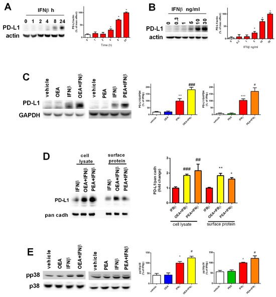 Figure 4. Involvement of PD-L1 and p38 MAPK in the effects of OEA, PEA, and IFNβ treatment on SH-SY5Y cells. Cells were treated with IFNβ for different lengths of times (A) and at different concentrations (B) to assess the effect of time and dose exposure to IFNβ on the levels of the programmed death-ligand 1 (PD-L1). * p < 0.05 versus vehicle. The values are expressed as percentage of IFNβ and are represented as the mean ± SEM of four independent experiments (A,B). Cells were treated as mentioned in Figure 3A and cell lysates were analyzed for PD-L1. The values are expressed as percentage of IFNβ. ** p < 0.01 and *** p < 0.001 versus vehicle; # p < 0.05 and ### p < 0.001 versus IFNβ. The results are represented as the mean ± SEM of four independent experiments (C). Cells were treated as reported in Figure 3A. The total cell extract (cell lysate) and biotinylated proteins (surface protein) were analyzed for PD-L1 by Western blot. The levels of PD-L1 in whole cell lysate and cell surface were normalized to pan cadherin (pan cadh), a plasma membrane marker. * p < 0.05 and ** p < 0.01 in surface protein versus IFNβ; ## p < 0.01 and ### p < 0.001 in the cell lysate versus IFNβ. Values are represented as the mean ± SEM of three independent experiments (D). Cells were treated as in Figure 3A, and cell lysates were analyzed for the phosphorylated and total p38 protein. * p < 0.05 versus vehicle; # p < 0.05 versus IFNβ (E).