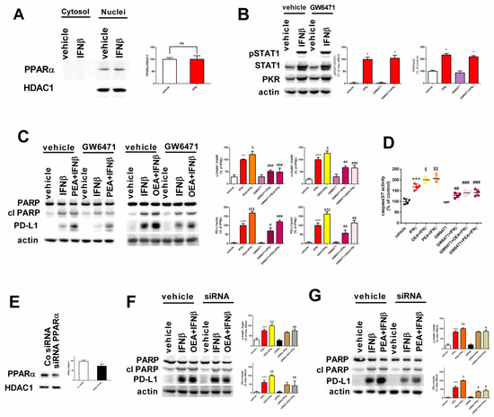 Figure 5. Implication of the PPARα receptor in the effects mediated by OEA, PEA, and IFNβ. Nuclear extracts were prepared and analyzed for PPARα receptor levels after IFNβ exposure. Values are represented as the mean ± SEM of four experiments; ns = not significant (A). Cell lysates were analyzed for STAT1 phosphorylation, STAT1, and PKR after treatment with IFNβ alone for 24 h in the presence and absence of GW6471 (6 μM). * p < 0.05 versus vehicle (B). Cells were pre-treated with 6 μM GW6471 (1 h) and were then exposed for 6 h to OEA or PEA, followed by IFNβ (24 h). Cell lysates were analyzed for PD-L1 and cleaved PARP (cl PARP). *** p < 0.001 versus vehicle; $ p < 0.05 and $$$ p < 0.001 versus IFNβ; # p < 0.05, ## p < 0.01, and ### p < 0.001 versus the corresponding value in control-treated cells (C). Cells were treated as mentioned before and caspase 3/7 activity was determined by a luminescence assay. *** p < 0.001 versus vehicle; $ p < 0.05 and $$ p < 0.01 versus IFNβ; ## p < 0.01 and ### p < 0.001 versus the corresponding value in control-treated cells (D). SH-SY5Y cells were transfected with either control siRNA or PPARα siRNA. * p < 0.05 versus vehicle-treated cells (E). Cells transfected with either control siRNA or PPARα siRNA were incubated for 24 h with either vehicle, IFNβ, or co-treated with IFNβ and OEA or PEA. Cell lysates were analyzed for cleaved PARP and PD-L1. *** p < 0.001 versus vehicle; $ p < 0.05 and $$ p < 0.01 versus IFNβ; # p < 0.05, ## p < 0.01 versus the corresponding value in control siRNA-treated cells. Values are the mean ± SEM of four independent experiments (F,G).