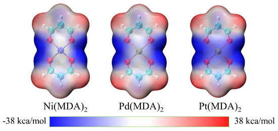 The MEP maps on the 0.001 electrons Bohr−3 surface of M(MDA)2 (M = Ni, Pd Pt). Red and blue regions represent positive and negative MEPs, respectively.