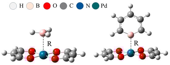 Optimized structures of BH3∙∙∙Pd(MDA)2 (left) and C5H5B∙∙∙Pd(MDA)2 (right), marked with the B∙∙∙M distance (R, Å).
