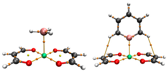 AIM diagrams of BH3∙∙∙Pd(MDA)2 (left) and C5H5B∙∙∙Pd(MDA)2 (right); bond paths are indicated by broken lines with bond critical point represented by small orange dots.