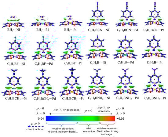 In order to study the interactions within the system more intuitively, we also conducted IRI analyses to visualize the interactions within the system. Figure 4 shows the IRI diagram of the systems. The isosurface between B∙∙∙M continuously turns blue with an increase in the M atomic mass, and for the systems containing BH3, this change is most pronounced, going from dark green between B∙∙∙Ni to blue between B∙∙∙Pd and then to dark blue between B∙∙∙Pt. This suggests that the TrB of these three systems transitions from interactions slightly stronger than those due to van der Waals forces to moderately strong interactions and then finally to strong interactions closer in strength to covalent bonds. In C5H4BX∙∙∙M(MDA)2, two light green isosurfaces on both sides of the target TrB are evident, which correspond to the bond path between H∙∙∙C in AIM analysis, thereby confirming the existence of secondary H-bond interactions. However, from the perspective of color, their intensities are small and comparable to van der Waals forces.