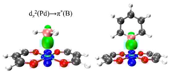 NOCV diagram of BH3∙∙∙Pd(MDA)2 (left) and C5H4BCN∙∙∙Pd(MDA)2 (right); the green electron cloud represents accepted electrons, while the blue electron cloud represents donated electrons. The symbol * denotes the empty B orbital.