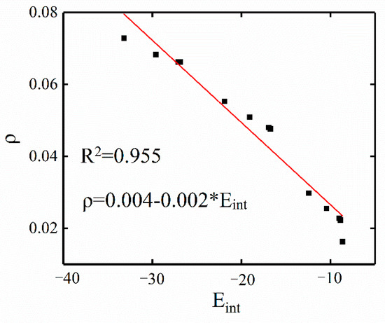 AIM analysis is one of the powerful tools for studying noncovalent interactions. AIM analysis shows that, in addition to the presence of BCPs between the target B∙∙∙M region, there are also two other BCPs in the C5H4BX systems, which correspond to two weak hydrogen-bonding secondary interactions. The interaction energy is the sum of all interaction strengths within the system. Will the presence of secondary interactions hinder the accurate description of the target TrB’s binding strength? In previous studies, good correlations between the electron density at the BCP and the corresponding interaction strength were reported [50,51], so the correlation between the TrB and the interaction energy can be used to measure the impact of secondary interactions on the total interaction energy. Figure 6 shows a good linear relationship between the electron density (ρ) at the B∙∙∙M BCP in C5H4BX∙∙∙M(MDA)2 and interaction energy (Eint). The scatter plot shows a very good correlation between Eint and ρ, with a correlation coefficient of 0.96, indicating that the contribution of secondary effects to the total interaction energy is very small.