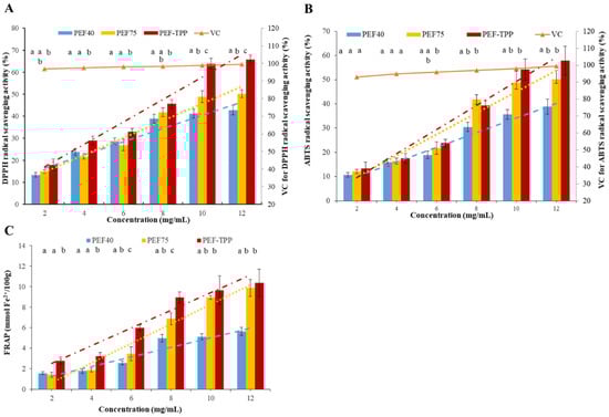 The ABTS assay is commonly used to evaluate the overall antioxidant capacity of individual compounds and diverse plant mixtures. In the range of low concentrations (2–4 mg/mL), the ABTS radical-scavenging ability of SDFs exhibited no statistically significant change (p > 0.05), as depicted in Figure 2B. However, a significant improvement (p < 0.05) in scavenging ability was observed with an increase in SDF concentration (4–10 mg/mL) for both the PEF75 and PEF-TPP, exhibiting similar scavenging rates. A similar value was reported for the SDF extracted via different methods from pear fruit pomace [18]. The IC50 values for the PEF75 (5.07 mg/mL) and PEF-TPP (5.56 mg/mL) were found to be similar, both of which were higher than the IC50 value for the PEF40 (7.61 mg/mL). Thus, the PEF-TPP SDF exhibited the highest scavenging capacity for ABTS, although it remained lower than that of the VC.