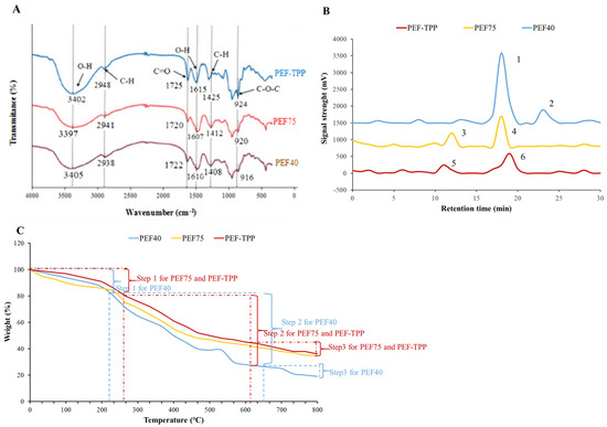 The molecular weights (Mw, Mn, and Pd) of the three SDFs derived from peanut shells were determined using HPGPC. The findings are displayed in Table 3 and Figure 3B. Notably, the distinct extraction methods yielded substantial variations in the molecular weights of the SDFs. Previous studies have indicated that diverse extraction methods have the potential to generate dissimilar molecular weights, thereby influencing the functional activity of SDF [47]. The PEF40, PEF75, and PEF-TPP exhibited bimodal distributions, with the primary peak displaying molecular weights of 324 kDa, 268 kDa, and 245 kDa, and retention times of 18.25 min, 12.31 min, and 11.29 min, respectively (Table 3). In comparison to the PEF40 and PEF75, the PEF-TPP SDF exhibited the lowest molecular weight. This occurrence can be attributed to the degradation of the cellulose and hemicellulose molecular chains induced by high voltage, resulting in the reduced molecular polymerization and heightened solubility of the PEF-TPP SDF [48]. According to Silva [49], prior research has demonstrated that low molecular weight DF is more effective in reducing cholesterol absorption and facilitating its excretion in feces. A lower polydispersity (Pd) coefficient typically signifies a more concentrated and uniform molecular weight distribution. The presence of a relatively low Pd value (Mw/Mn = 2.58) in Peak 5 of the PEF-TPP SDF suggests that it possesses a concentrated and uniform distribution of molecular weight.