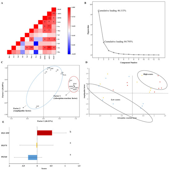 The evaluation of the characteristics of the SDFs obtained using different methods. (A) Heat map of Pearson’s correlation coefficient among the antioxidant capacities and monosaccharide components. Gradient color barcodes at the right indicate the minimum value in blue and the maximum in red (for the interpretation of the references to the colors in this figure’s legend). * Significant at p < 0.05, ** Significant at p < 0.01; (B) Screen plot of the PCA of the characteristics of SDFs obtained using different methods; (C) The loading scatter plot of the PCA of the characteristics of SDFs obtained using different methods; (D) PCA score scatter plot of characteristics of SDFs obtained using different methods (red spots are PEF-TPP scores, yellow spots are PEF75 scores, and blue spots are PEF40 scores); (E) The synthesis scores of the three methods tested.