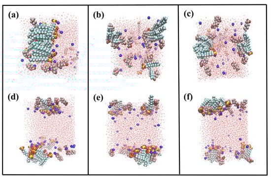 Snapshots of simulated boxes with different molar ratios of mixed surfactants (brown, red, gray, blue, yellow and green spheres represent fluorine, oxygen, hydrogen, sodium, sulfur and carbon atom, respectively). (a) PFHXA/SDS = 1:3; (b) PFHXA/SDS = 1:1; and (c) PFHXA/SDS = 3:1, shown in top view (a–c) and side view (d–f).