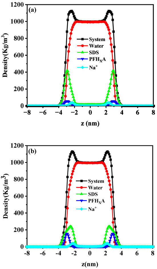 We calculated the density distribution of the mixed surfactant system to determine the composition of the interfacial layer and the distribution of its various components. A snapshot of the equilibrium of the monolayer of adsorbed PFHXA/SDS mixture is shown in Figure 3 and Figure S2. It can be seen that the aggregation behaviors of the PFHXA/SDS mixtures are different from those of pure SDS from the top and side views. The distribution of the mixtures at the air/water interface gradually becomes homogeneous with the increase of PFHXA and forms a dense adsorbed monolayer. As the mixed surfactant head groups hydrate and penetrate the aqueous phase, the carbon chains extend towards the air, and the nearby counterions are drawn to and move towards the interface, resulting in a corresponding decrease in the number of water molecules at the interface. According to the above-mentioned results, the hybrid PFHXA/SDS surfactant may possess sufficient surface activity in contrast to pure SDS surfactant. Additionally, the components’ density distributions along the z-axis in the mixed systems were also calculated. Figure 4 shows that PFHXA and SDS anionic surfactants exhibit a notable difference in peak distribution on the x-coordinate axis. PFHXA tends to be closer to the gas phase, while SDS is more likely to be in close contact with the aqueous phase. The surfactant mixture forms a stiff film at the air–water interface as a result of the hydrophobic interactions between the alkyl chains. Furthermore, more short-chain fluorocarbon surfactant molecules are found in the clefts of the hydrophobic chains of SDS, generating mixed adsorption, whereas a smaller number of PFHXA molecules compete with SDS for adsorption. Due to PFHXA’s hydrophobic nature, the monomolecular film of the surfactant became more homogeneous with increasing PFHXA ratio. The minimum peak distance between PFHXA and SDS is achieved when their mixing ratio is 1:1, suggesting that the two surfactants were well-compatible. The findings demonstrated that at the air/water interface, the PFHXA/SDS mixed surfactants displayed high surface activity. The interfacial density distribution cannot be used as an evaluation criterion to assess the interfacial performance, even though it may partially reflect the synergistic impact.