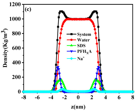 Density profiles of surfactants with different molar ratios along the z-axis direction. (a) PFHXA/SDS mixture ratio equal to 1:3, (b) PFHXA/SDS mixture ratio equal to 1:1, and (c) PFHXA/SDS mixture ratio equal to 3:1.