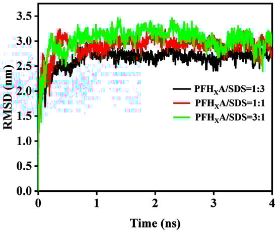 Figure 5 displays the root mean square deviation (RMSD) of SDS over time with mixed surfactants. The root mean square deviation (RMSD) of PFHXA is shown in Figure S4. The MD simulation starts with a significant rise in the RMSD. However, the RMSD curve changed less after 1 ns. The average RMSD values of SDS surfactant in the mixed system were (2.71 ± 0.12) nm, (2.95 ± 0.15) nm, and (3.21 ± 0.37) nm, respectively. These RMSD measurements show that the SDS surfactant in the mixed monolayer underwent a significant shift at time t in comparison to its starting state at time t = 0. Furthermore, the RMSD variation of the SDS surfactant becomes very minor after 1 ns, indicating that there has been no significant change in conformation and that the system has reached equilibrium by 1 ns into the simulation [24].
