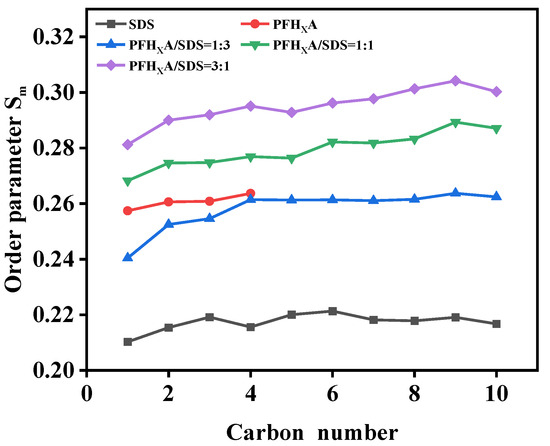 In Equation (3), the vector between the carbon atom connected to the hydrophilic group (Cn atom) and the next carbon atom (Cn+1 atom) forms an angle with the molecular axis of the hydrocarbon chains of ionic surfactants. The range of the computed order parameter should be −1/2 to 1. A value of −1/2 indicates an ordered arrangement of surfactant molecules along the perpendicular z-axis that is completely ordered in its direction, whereas a value of 0 for the order parameter indicates an isotropic arrangement [25,26,27]. As part of this investigation, an index file including all of the alkyl tail chain carbon atoms will be constructed in order to average the orderliness parameter over similar molecules in the system. The surfactant tends to be more perpendicular to the interfacial direction as the order parameter value increases because the direction of the line connecting the two atoms in the surfactant molecule becomes smaller in angle with the z-axis. It is not advantageous for surfactant tail chains to cover the water surface in this scenario. Instead, the angle between the direction of the atoms and the normal approaches 90° the lower the value of the order parameter, and the more it tends to be parallel to the interfacial direction. At the gas–liquid interface, we measured the ordering parameter of pure surfactant and PFHXA/SDS hybrid system. The findings are depicted in Figure 6.