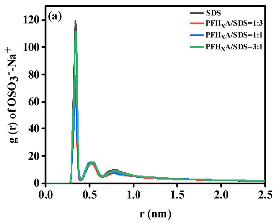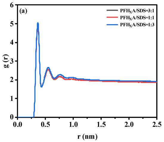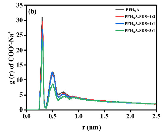 The interfacial properties of surfactants are mostly determined by their interaction with water. Hydrophilic groups and water molecules engage in robust hydrogen bonding interactions. Therefore, in order to quantitatively characterize their interaction, the radial distribution function (RDF) between the head group and the water molecule was calculated, as shown in Figure 7. It is evident that the RDF forms of the three systems are similar. Therefore, adding PFHXA does not break the water shell surrounding SDS. It has been demonstrated that the interaction between the headgroup and the water molecule is largely determined by the first hydration water shell surrounding the headgroup [28], and in this paper, the first peak is chosen to study this interaction. In Figure 7a, the g(r) of the -OSO3−-OW pair shows that the system formed by the mixed PFHXA/SDS monolayer has four peaks at 3.56, 5.46, 7.64, and 9.58 Å (corresponding to the system without PFHXA surfactant), but the water molecules at a distance of 9.58 Å from the -OSO3− group are considered to be unbound water. The peak at 3.56 (first peak) shows that there is a strong interaction between the oxygen atom of the -OSO3− head group and the hydrogen atom of the water molecule, forming a hydrogen bond. Additionally, as the concentration of PFHXA in the air/water increased, the peak height of the first peak of the -OSO3−-OW pair decreased. As can be observed, the initial peak intensity decreases in the following order: PFHXA/SDS = 1:1 > PFHXA/SDS = 3:1 > PFHXA/SDS = 1:3. This trend might be explained by the addition of PFHXA, which significantly lowers the concentration of Na ions near -OSO3−. Na ions are poorly hydrated, and when they interact with -OSO3− groups, they can release some water molecules. Water molecules are more likely to clump together with the -OSO3− group as the quantity of Na ions in the area around it drops. It is demonstrated that COO- in the hydrophilic head group of PFHXA significantly affects the structure of water. Similar results were obtained from the RDF results of COO− and water head groups, as shown in Figure 7b. Hydrogen bonding as well as nearby hydrogen bonding interactions between COO− and water are represented by these two water shells around COO−. The RDF curve flattens down with increasing distance due to decreased hydrogen bonding interactions between COO− and water. The difference in the intensity of the first peak compared to the second peak is significant. The decreasing order of the intensity of the first peak is: PFHXA/SDS = 1:1 > PFHXA/SDS = 3:1 > PFHXA/SDS = 1:3. The higher interfacial contact and lower interfacial tension are shown by the larger first peak intensity. Therefore, the surface activity should be weakened in the same order, and the PFHXA/SDS blend surfactant with a molar ratio of 1/1 showed good effectiveness in lowering surface tension.
