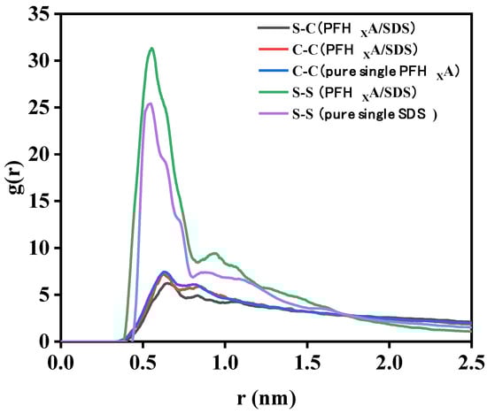 At the interface between air/water, we investigated the interactions between the polar groups of a PFHXA/SDS combination at a ratio of 1:1. In PFHXA/SDS surfactant mixtures, the radial distribution function (RDF) of the carbon atoms in the carboxyl group and the sulfur atoms in the sulfonate group was computed, and the results are shown in Figure 9. The characteristic peak of the S-S atom RDF in the pure SDS system is approximately 3.82 Å, which is also the same characteristic peak as the mixed system. This suggests that the configuration of the sulfonic acid groups is unaffected by the addition of short-chain fluorocarbon surfactants. Similarly, the carbon atom RDF distribution remains unchanged when SDS is added to PFHXA.