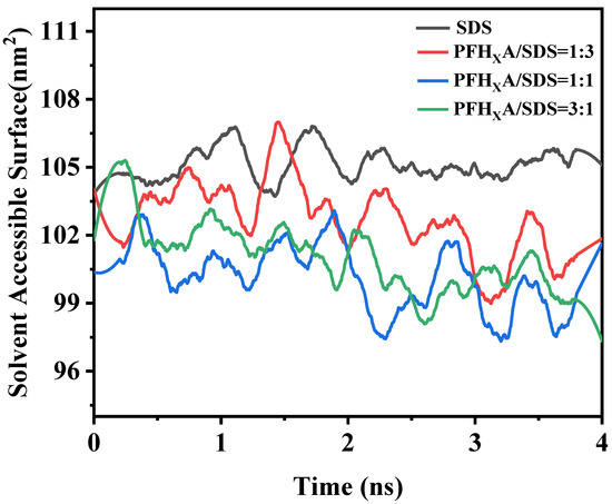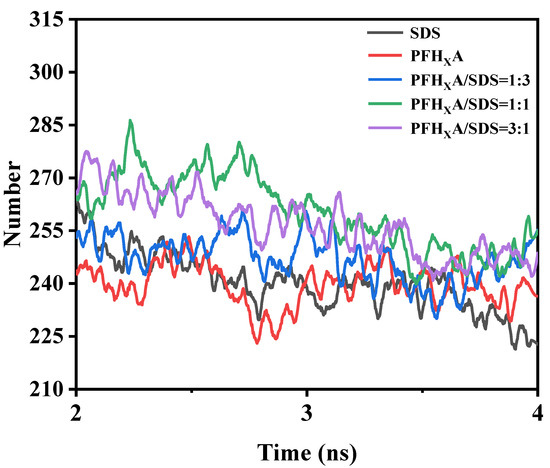 The hydrophilic group occupied area is the region that the hydrophilic groups in the surfactants occupy; changes in this region can be intuitively interpreted to be changes in the surfactant aggregation pattern at the interface. Analyzing the soluble surface area of surfactants can reveal more information about the simulated system. This section used the g-sasa function to calculate the area occupied by the hydrophilic groups of the four surfactants, as shown in Figure 10. For the duration of the set simulation time, each curve of system keeps rising and falling. In pure SDS, the hydrophilic group occupied area is the largest. When PFHXA was added to the SDS surfactant, PFHXA and SDS competed for adsorption at the interface, and the hydrophilicity of the hydrocarbon chains of SDS caused them to be preferentially adsorbed at the gas–liquid interface. The quantity of fluorocarbon chain that was adsorbed at the interface increased as the molar fraction of PFHXA increased, while the amount of hydrocarbon chain that was adsorbed reduced. Meanwhile, and the fluorocarbon chain was arranged more tightly, the adsorption amount and the tightness of the arrangement of hydrocarbon chain and fluorocarbon chain reached the optimal level when PFHXA/SDS = 1:1. Continue to increase the molar fraction of PFHXA, when PFHXA/SDS = 3:1, the amount of PFHXA is absolutely dominant, the gas–liquid interfacial tension is elevated. It gradually converges to the nature of the one-component aqueous solution of PFHXA, and the surfactant SASA is elevated. This result further shows that a more solvent-accessible surface might be achieved by mixing surfactants in an appropriate ratio.