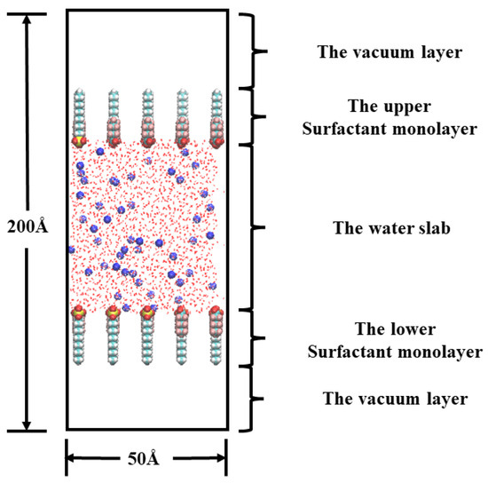 The sandwich model system should be built as seen in Figure 1. First, the spatial box dimensions were established. In the spatial right-angled coordinate system, the side lengths in the X, Y, and Z axes were set to 50 Å, 50 Å, and 200 Å, respectively. Water molecules were added in the center of the box, and the thickness of the water molecule layer was 50 Å, isolating the interaction between the upper and lower surfactant layers, and then two layers of the specified number of mixed surfactant molecules consisting of PFHXA and SDS were placed on the upper and lower sides of the aqueous solution. The hydrophobic chain segments of the surfactants are situated away from the water surface, while the hydrophilic groups are oriented toward the water molecules. The surfactant molecular chain is in a completely expanded conformation and is positioned vertically in the X–Y plane. The center of the box is also where the system center of mass is located. An air/surfactant/water/surfactant/air interfacial system is created by setting up a vacuum (gas phase) above and below the box. The vacuum length on the z-axis should be sufficient to completely minimize the system effect of periodicity. To maintain the system’s electrical neutrality, a certain number of sodium ions were added randomly to the water slab. Table 2 displays the total quantity of water molecules and surfactant molecules present in each of the simulated systems.