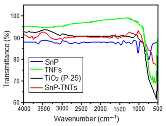 FT-IR spectra of spectra of TiO2 (P-25), SnP, TNFs, and SnP-TNTs in KBr.