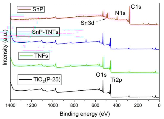 XPS survey spectra of TiO2 (P-25), SnP, TNFs, and SnP-TNTs.