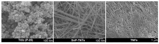 FE-SEM images for TiO2 (P-25), SnP-TNTs, and TNFs.