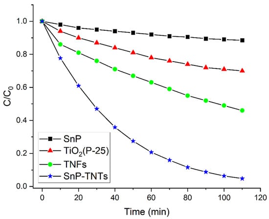 The degradation coefficient, expressed as (C0 − C)/C0, was utilized to assess the photodegradation of MB, where C0 and C represent the MB concentrations at time zero and time t, respectively. The calculated photodegradation rates for MB were 13% for SnP, 30% for TiO2 (P-25), 54% for TNFs, and 95% for SnP-TNTs over 110 min of visible-light exposure (Figure 7). Notably, SnP-TNTs demonstrated the highest efficiency in removing MB during photodegradation compared to SnP, TiO2 (P-25), and TNFs.