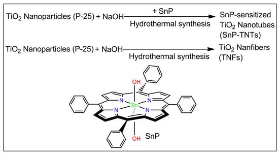 Previously, our group reported the photodegradation of methyl orange dye by Sn(IV) porphyrin-sensitized TiO2 nanofibers under the irradiation of visible light. Under basic conditions, a novel heterostructure is produced through a one-step hydrothermal reaction involving trans-dihydroxo [5,10,15,20-tetrakis(p-tolyl)porphyrinato]Sn(IV) and pure anatase TiO2 powder [35]. Sn(IV) porphyrins are ideal building blocks for photo-functional materials used for visible light catalysis. The oxophilic character of the Sn(IV) porphyrin center can easily construct stable six-coordinate diamagnetic complexes with either alkoxides or carboxylates. In particular, the trans-dihydroxo complex of the Sn(IV) porphyrin has a strong affinity toward transition metal oxides. These complexes are also known for their unique photo-physical properties. Therefore, structural studies of these compounds via various spectroscopic techniques are of significant value [36,37,38,39,40,41,42]. Within this context, the present study employs a one-step hydrothermal reaction between trans-dihydroxo(5,10,15,20-tetraphenylporphyrinato)Sn(IV) (SnP) and TiO2 (P-25, 85% anatase and 15% rutile) in basic conditions to fabricate Sn(IV) porphyrin-imbedded TiO2 nanotubes (SnP-TNTs) (Scheme 1). To know the impact of Sn(IV) porphyrin on the fabrication of SnP-TNTs, we repeat the above experiments without SnP. Interestingly, we observed TiO2 nanofibers (TNFs).
