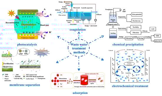 Addressing this water scarcity necessitates innovative solutions, with the harnessing and repurposing of wastewater emerging as a pragmatic approach. Viewed through this lens, wastewater transforms into a prospective reservoir of “new” potable water. When judiciously treated, it can cater to diverse consumption needs, offering tangible social, environmental, and economic dividends [6]. To date, researchers have pioneered an array of wastewater treatment methodologies, as delineated in Figure 1. These encompass techniques like photocatalysis [7,8,9,10,11,12,13], coagulation [14,15,16,17,18], chemical precipitation [19,20,21,22,23], electrochemical treatments [24,25,26,27], adsorption [28], and membrane separation [29].