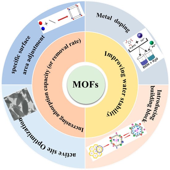 However, despite MOFs’ unparalleled adsorption prowess, challenges persist. Complex synthesis routes, suboptimal yields, and elevated raw material costs impede their widespread adoption in water treatment [65]. Numerous strategies are currently under exploration to amplify their efficacy and aqueous stability, as depicted in Figure 2.