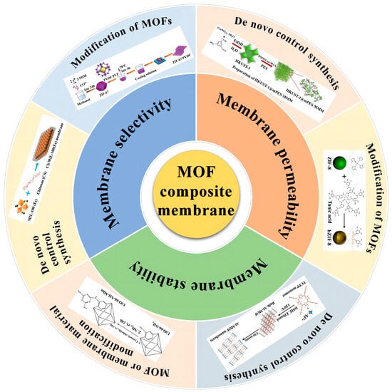 MOF-based mixed matrix membranes (MMMs) are crafted by integrating MOF nanoparticles into polymers or by coating the membrane surface with MOFs. This approach leverages the spatial structure and abundant pores of MOFs combined with the selective permeability of polymer membranes. Such a synergy not only addresses the trade-off between permeability and selectivity inherent in polymer membranes but also bolsters their mechanical strength and thermal stability [67]. Consequently, the fabrication and application of MOF-based MMMs in water treatment have emerged as pivotal areas in the industrial utilization of MOFs. This surge in interest has prompted the scientific community to prioritize research on MOF-based MMMs, with a focus on three primary challenges: membrane permeability, selectivity, and stability. This section delves into strategies to optimize the properties of MOF-based MMMs.