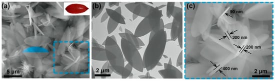 (a) SEM images of 2D ZIF-L [101]; Copyright 2021, Elsevier. (b) SEM images of 2D ZIF-L [101]; Copyright 2021, Elsevier. (c) TEM images of 2D ZIF-L [101]. Copyright 2021, Elsevier. Reprinted/adapted with permission from Ref. [101].