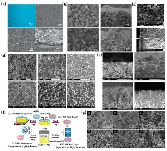 (a) Leica picture of the surface of the Ni2(L-asp)2 (bipy) membrane, SEM pictures of the surface of the Ni2(L-asp)2 (bipy) membrane and details of the densely packed crystallites and a cross-section SEM picture of the Ni2(L-asp)2 (bipy) membrane [111]; Copyright 2013, The Royal Society of Chemistry. (b) SEM images of ZIF-8 membrane grown for 2 min and for 30 min [112]; Copyright 2013, American Chemical Society. (c) SEM images of surface and cross-sectional morphology of MOF-5 thin membrane [113]; Copyright 2013, Elsevier. (d) a) SEM of ZIF-8 seed layer and membrane synthesized at 30 °C for b) 0.5 h, c) 1 h, d) 2 h, e) 4 h and f) 6 h [114]; Copyright 2011, Elsevier. (e) SEM pictures of the cross-section of ZIF-8 membrane synthesized at 30 °C for a) 1 h, b) 2 h, c) 4 h and d) 6 h [114]; Copyright 2011, Elsevier. (f) Schematic illustration of ZIF-300 membrane preparation process [115]; Copyright 2018, Elsevier. (g) SEM images of as- prepared ZIF-300 MOFs particles immersed in feed solutions at 25 °C for 30 days (a, CuSO4/H2O; b, CdSO4/H2O; c, CoSO4/H2O; d, RhB/H2O; e, MB/H2O; f, MO/H2O). The concentration of dye solution is 50 ppm, and the heavy metal ion solution are 10 mM [115]. Copyright 2018, Elsevier. Reprinted/adapted with permission from Refs. [111,112,113,114,115].