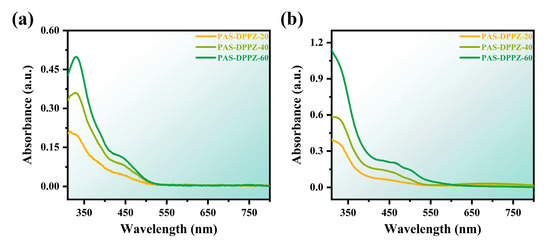 The fundamental optical properties that characterize polymeric substances were explored with the help of UV–vis absorption spectroscopy. Limited by solubility, comparative trials were performed exclusively across PAS-DPPZ-20, PAS-DPPZ-40, and PAS-DPPZ-60. The data obtained are summarized in Table 2. The UV–Vis absorption spectra in NMP solution (Figure 1a) revealed that the intensity of the characteristic absorption peaks (316 nm–331 nm) ascribed to phenazine increased with the growing share of phenazine moieties as part of the polymer chain segments [43]. Concurrently, a new peak began to appear near the wavelength of 430 nm and continuously enhanced owing to the intramolecular charge transfer (ICT) effect that initiated between the electron-rich and electron-deficient groups. The spectral absorption for the solid-state film (Figure 1b) demonstrated a broadly comparable pattern of variation versus that of the solution. There was only a limited degree of redshift in the spectrum as a whole. The intensity of the redshift phenomenon was positively correlated with the total conjugation level within the polymer.