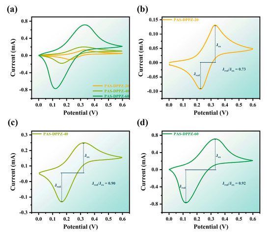 The cyclic voltammetry (CV) curves were measured in an inert gas atmosphere for the materials using indium tin oxide (ITO) glass spin-coated with a polymer film as the working electrode, a Ag/Ag+ electrode as the reference, and a platinum wire as the counter electrode (Figure 2 and Figure S5). The experiments were carried out in an acetonitrile (ACN) solution with tetrabutylammonium perchlorate (TBAP) at a concentration of 0.1 M. The specific redox process is illustrated in Scheme 2. With that in mind, the electrochemical properties of PAS-DPPZ-20, PAS-DPPZ-40, and PAS-DPPZ-60 were evaluated. Primarily, a pair of redox peaks existed in the cyclic voltammetry curves of all three polymers, which corresponded to the reversible redox process of phenazine [44]. Moreover, increasing the proportion of phenazine groups in the polymers contributed to the overall electrochemical enhancement upon comparison. It was specifically reflected by the growth in the redox peak current density in the cyclic voltammetry curves; the reduction in the onset oxidation potential (Eonset) and half-wave potential () (Eonset: 0.18 V–0.11 V, E: 0.26 V–0.20 V); the increase in the ratio between the reduction and oxidation peak current (Jred/Jox) (0.73–0.92); and the decrease in electrochemical degradation after 10,000 consecutive cyclic voltammetry cycles. In the CV curve, the higher peak current represented the better electrochemical activation of the material; the closer the value of Jred/Jox to one, the greater the reversible extent of this electrochemical redox process [45]; and lower Eonset and commonly imply more excellent electrochemical stability. The significant improvement in these indicators was undoubtedly evidence of the success of the modification strategy that introduced phenazine-based redox-active centers into high-performance polymers in order to endow them with electrochemical properties. This initiative made the already superior physicochemical properties of PAS break through the constraints imposed by their own lack of electroactivity in order to shine in electrochemical-related areas. This tremendously expands usage opportunities and enhances the actual application value of the materials.