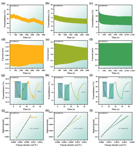 (a–c) Variation in transmittance in electrochromic stability tests for PAS-DPPZ-20, PAS-DPPZ-40, and PAS-DPPZ-60; (d–f) variation in current at the working electrode in electrochromic stability tests for PAS-DPPZ-20, PAS-DPPZ-40, and PAS-DPPZ-60; (g–i) coloring/bleaching time of PAS-DPPZ-20, PAS-DPPZ-40, and PAS-DPPZ-60; (j–l) coloration efficiency of PAS-DPPZ-20, PAS-DPPZ-40, and PAS-DPPZ-60 (obtained by linear fitting).