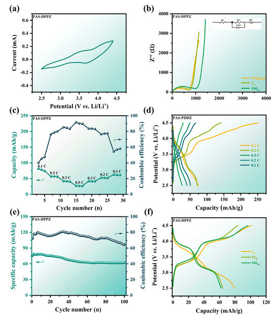 The batteries of PAS-DPPZ with (a) CV curves (1.5–3.5 V) at 0.1 mV/s, (b) Nyquist plots (initial, 1, and 100 cycles), and corresponding equivalent circuit diagrams, (c,d) the rate capability and charge/discharge curves at 0.1 C, 0.2 C, 0.3 C and 0.5 C, (e) cycling performance and coulombic efficiency at 0.1 C, and (f) charge/discharge curves (1, 10, and 100 cycles) at 0.1 C.