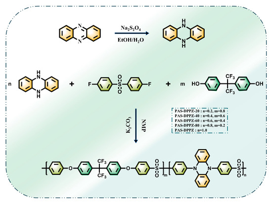 Scheme 1 depicts the synthetic route of the target polymers in detail. Series of phenazine-based poly(aryl ether sulfone) polymers were prepared by a modified C–N coupling procedure [36]. The polymerization was carried out in N-methylpyrrolidone (NMP) under conditions of 2.5 equivalents K2CO3 as a catalyst through adapting the ratio of monomers 5,10-dihydrophenazine and bisphenol AF. The polymers obtained were washed with deionized water and anhydrous ethanol before purification by Soxhlet extraction to remove products with relatively low molecular weight. The polymeric materials with narrow molecular weight distribution were ultimately gained. Based on the proportion of phenazine-based monomer in the polymers, they were designated as PAS-DPPZ-20, PAS-DPPZ-40, PAS-DPPZ-60, PAS-DPPZ-80, and PAS-DPPZ. 1H NMR and FT-IR were selected for the structural characterizations of the subject polymers, and the results are shown in Figures S1 and S2. The FT-IR spectra of the polymers displayed duly characteristic absorption peaks near 1322 cm−1, 1303 cm−1, 1256 cm−1, and −1109 cm−1 wavenumbers corresponding to the C-SO2-C, N(Ar)3, Ar-O-Ar, and CF3 stretching vibrations, as appropriate [38,39,40].