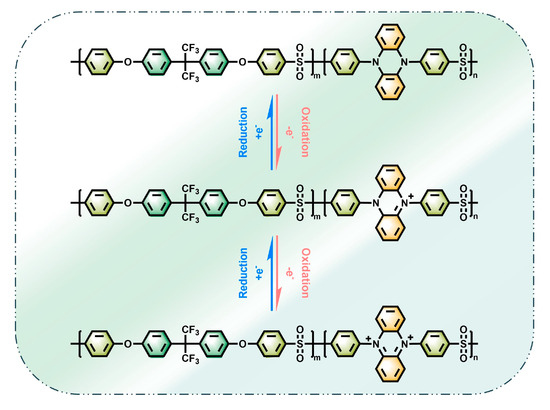 Herein, phenazine was selected as the electroactive center and poly(aryl ether sulfone) as the basic backbone to construct functionalized poly(aryl ether sulfone) materials via a facile and efficient C–N coupling method [36]. The synthesized serial polymers fulfilled the design strategy as expected by combining the excellent and steady electrochemical activity of phenazine with the prominent comprehensive performance of PAS itself. Phenazine-based functionalized PAS suitable for diverse alternative applications were fabricated with adjusted phenazine moiety occupancy ratios. Among them, PAS-DPPZ-60, employed as an electrochromic material, exhibited just a slight degradation in optical contrast (ΔT) following up to 12,000 s (600 cycles) of circulation. PAS-DPPZ, meanwhile, a candidate as an organic battery cathode material, demonstrated a theoretical specific capacity of 126 mAhg−1 and a promising battery performance, with a capacity maintained up to 82.6% after 100 cycles at a 0.1 C current density.