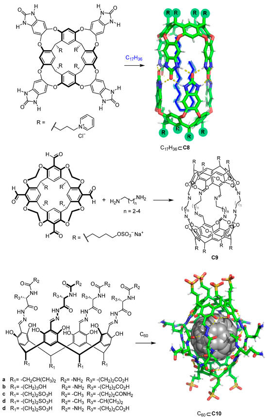 In addition to carboxylate or amino moieties, other water-solubilizing groups such as pH-independent charged groups enable the design of water-soluble cages regardless of the pH (Figure 7). As an example, Rebek and coworkers used positively charged pyridinium moieties that conferred solubility to the cage. The reported cages were formed by the dimerization of water-soluble pyridinium cavitands around hydrophobic guests to obtain cage C8 [42,43]. The use of sulfate or sulfonic groups, which also have a pH-independent negative charge, also allows water solubility to be obtained. For instance, Warmuth and co-workers prepared cage C9 by incorporating R-OSO3− water-solubilizing groups [44], whereas Szumna and co-workers prepared peptide-based water-soluble cavitands featuring sulfonic groups (R-SO3−). In the latter case, the authors observed that the cavitands self-assembled into cage C10 in the presence of C60. This encapsulation process of one molecule of fullerene C60 is driven by the combination of C60–cage hydrophobic interactions and complementary hydrogen bonding between the peptide chains of the cavitands [45].