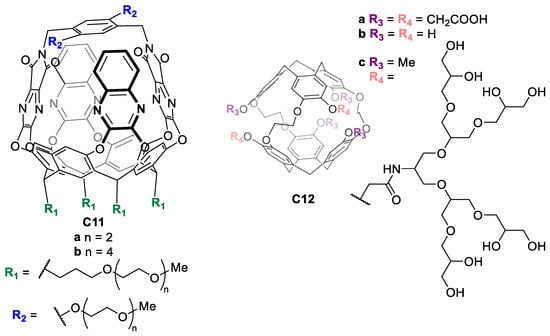Other water-solubilizing groups are polyethylene glycol (PEG) or hydrophilic neutral oligomers, which can be used to enhance the water solubility of the cage. For instance, Diederich and coworkers synthesized molecular baskets C11 based on a resorcin [4] arene cavitand functionalized with long PEG chains to achieve water solubility (Figure 8) [46]. In another example, Rousseau and coworkers prepared cryptophanes C12 functionalized with non-ionic polyglycerol dendrons, enabling water solubility as well as biocompatibility, as these groups reduce non-specific binding to biological targets (Figure 8) [47].