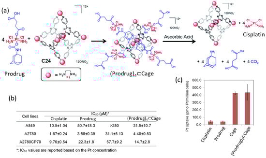 Anticancer activity of the host–guest complex assembled from the Pt(IV) prodrug and the Pt(II) cage. (a) Schematic representation of guest encapsulation and release by reduction with ascorbic acid. (b) Cytotoxicity profiles against A549 (lung cancer), A2780 (ovarian cancer), and A2780CP70 (ovarian cancer resistant to cisplatin) cell lines. (c) Cellular uptake in A2780CP70 cells ([Pt] = 30 μM, 4 h, 37 °C, 5% CO2). Adapted with permission from reference [68] with the Creative Commons CC BY license http://creativecommons.org/licenses/by/3.0/ (accessed on 3 April 2024). Copyright 2015, the authors of the original publication.