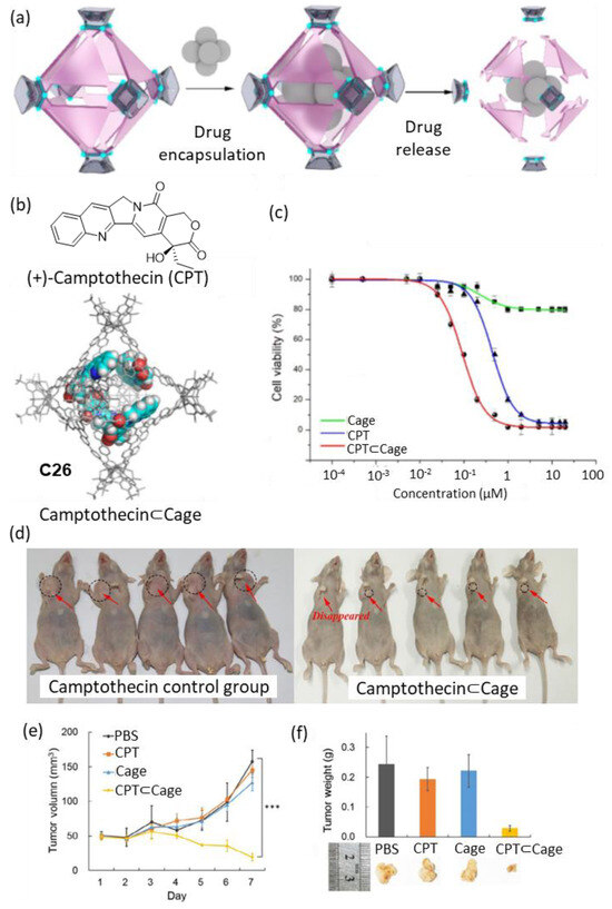 Zhou and coworkers developed a metal–organic cage that decomposed gradually, releasing the encapsulated drug at a constant rate (Figure 13). The cage showed complete decomposition at physiological pH (i.e., pH = 7.4) in seven days, with an acceleration of the decomposition kinetics when the acidity of the media was increased to pH = 6.5. The cage encapsulated four molecules of the anticancer drug Camptothecin (Figure 13b). Cell viability in vitro was tested in four human cancer cell lines: HeLa, SKOV3 (ovarian carcinoma), H1299 (lung cancer), and HepG2 (liver hepatocellular carcinoma). Concentrations of free cage around 1 µM resulted in cell viabilities of approximately 90%, indicating the low toxicity of the cage. When Camptothecin was encapsulated in cage C26 a value of IC50 = 0.09 μM was found, which contrasted with the IC50 = 0.68 μM of free Camptothecin (Figure 13c). The authors also tested the anticancer activity of Camptothecin⊂Cage in vivo in a xenograft tumor mouse model of HepG2 cells in BALB/c nude mice. For this, an intravenous injection of Camptothecin⊂Cage (daily administration of 200 µL with concentration 21.6 nM for 7 days) and the corresponding controls were carried out. It was observed that the Camptothecin⊂Cage had a significant effect on the reduction of the tumor volume, demonstrating the efficiency of the cage as a sustained drug release agent (Figure 13d–f) [71,72].